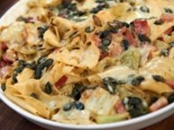 3. Schinken erst in Streifen, dann in 2 cm große Stücke schneiden. In einer Pfanne mit 2 El Öl knusprig braun anbraten. Schinken zusammen mit den Nudeln unter den Kohl mischen. Alles in eine Auflaufform geben. Käse raspeln und über die Kohlmischung streuen. Kürbiskerne darübergeben und im heißen Ofen bei 220 Grad (Umluft 200 Grad) ca. 10 Min. überbacken.
